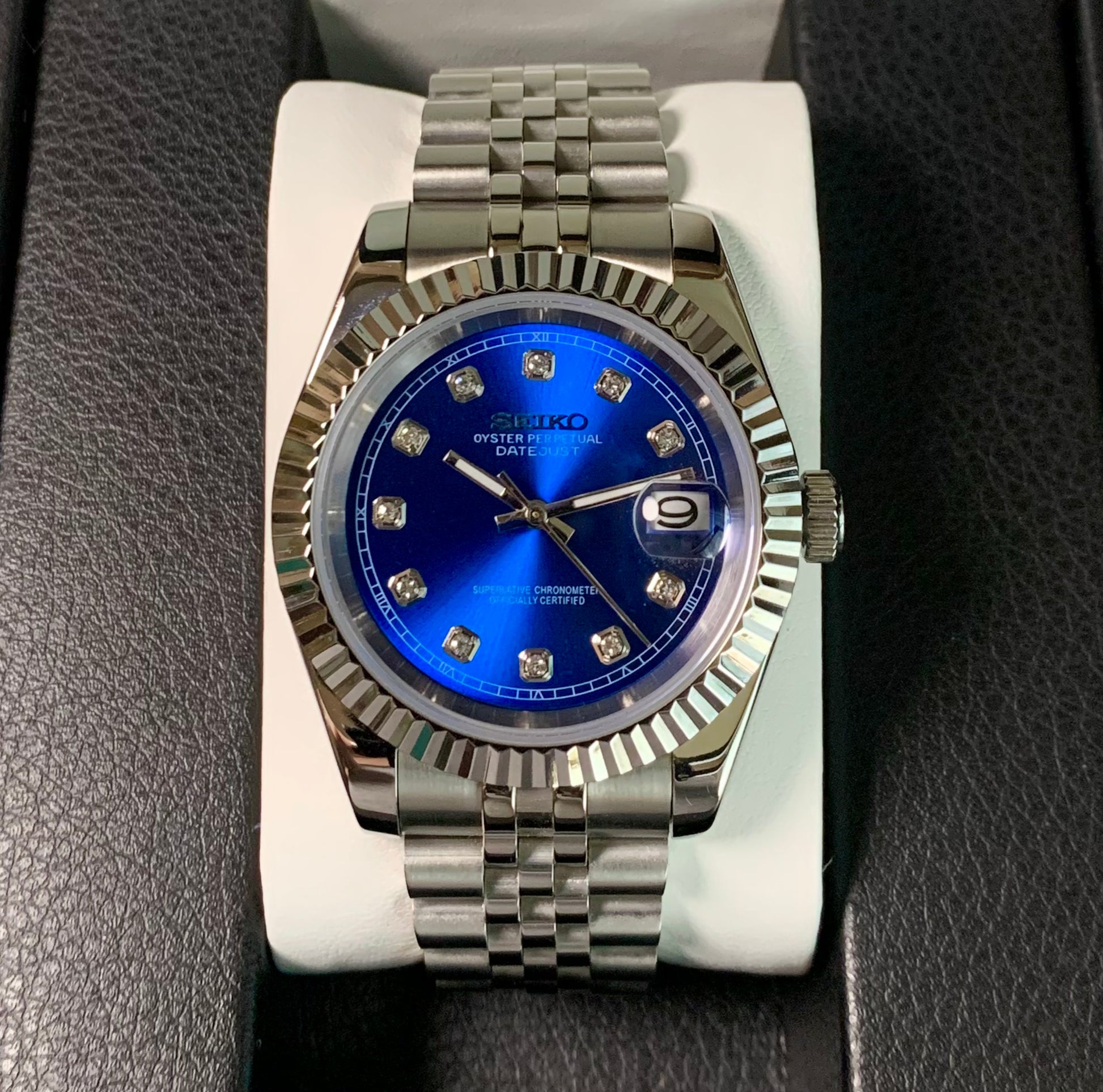 Introducing the “Blue Diamond Dial,” a breathtaking timepiece that embodies elegance and sophistication. This exquisite watch features a stunning deep blue dial, captivating the eye with its rich hue that exudes a sense of luxury. The standout feature of this watch is its diamond numerals, meticulously set to shimmer and sparkle, adding a touch of brilliance and refinement to the overall design.